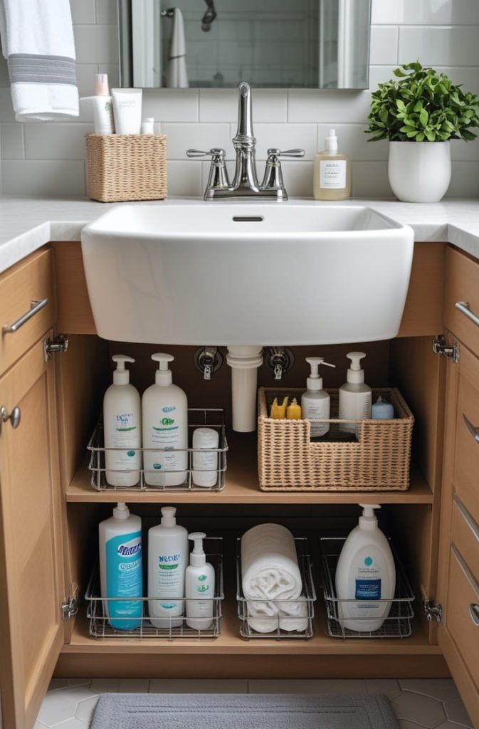 The space beneath your sink is often overlooked, but it’s one of the most versatile storage areas. I love adding pull-out bins, stackable drawers, or baskets to bathroom vanity storage ideas. These solutions make it easy to separate cleaning supplies, toiletries, and extra toilet paper.