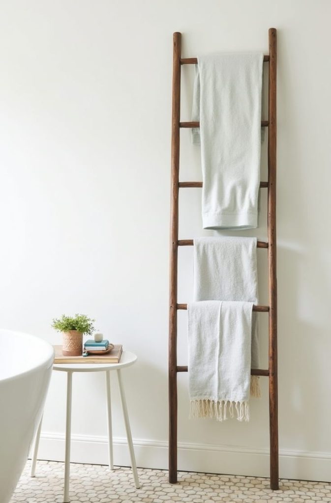 Wall-mounted towel racks save space while keeping towels within reach. For larger bathrooms, ladder-style racks add a modern touch and provide vertical storage for multiple towels.