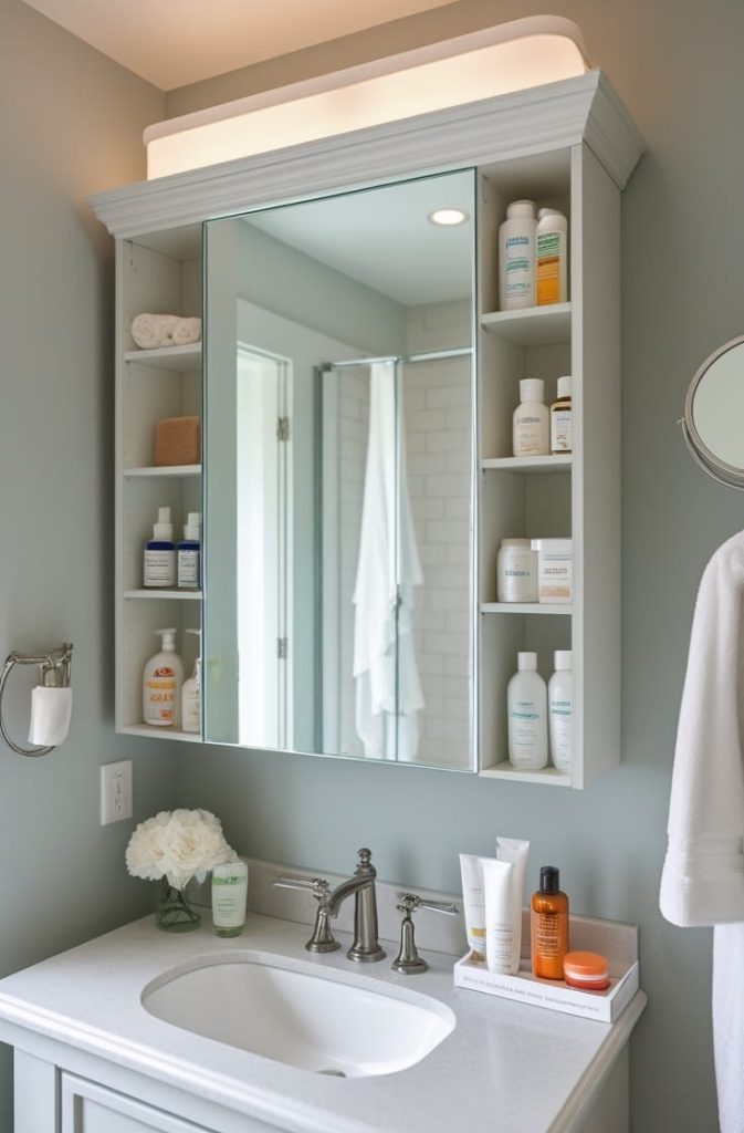 Mirrored cabinets serve a dual purpose: they save space and add visual depth to your bathroom. I’ve found that grouping items by type—daily essentials, beauty products, and medications—makes life so much easier.