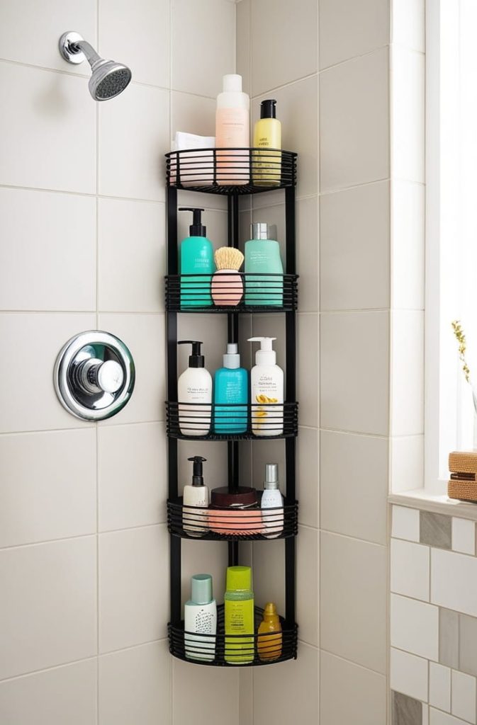 For tight bathrooms, a corner caddy inside the shower is particularly useful. It keeps all your shower essentials organized while keeping the floor and bathtub edges clear.