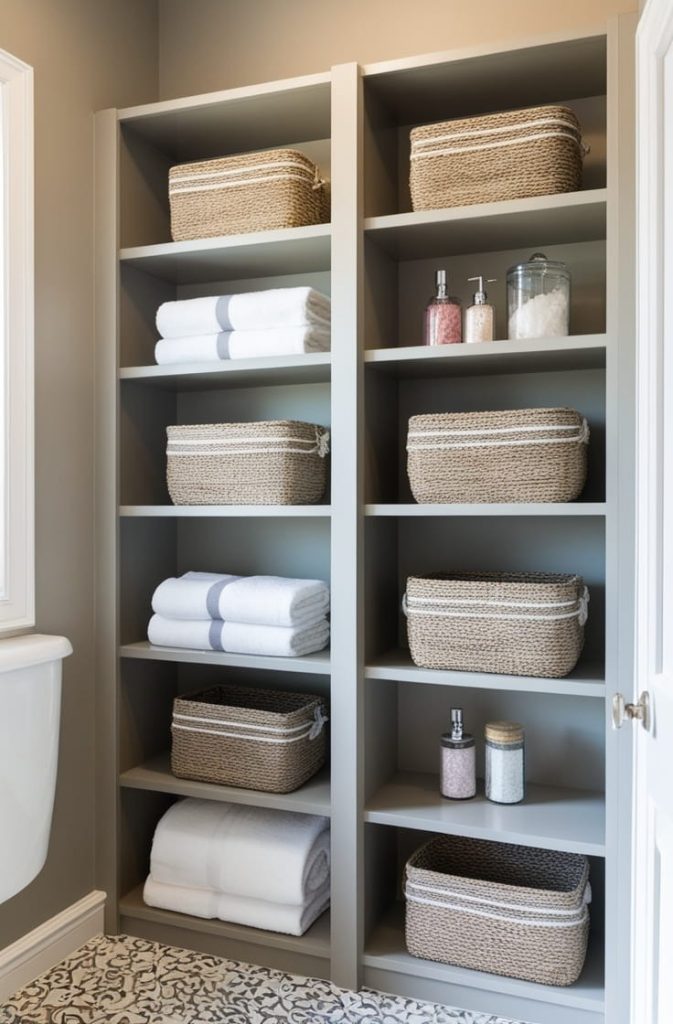 This works well for hand towels, bath salts, or extra toiletries. Open shelving encourages maintaining neatness because items are visible.