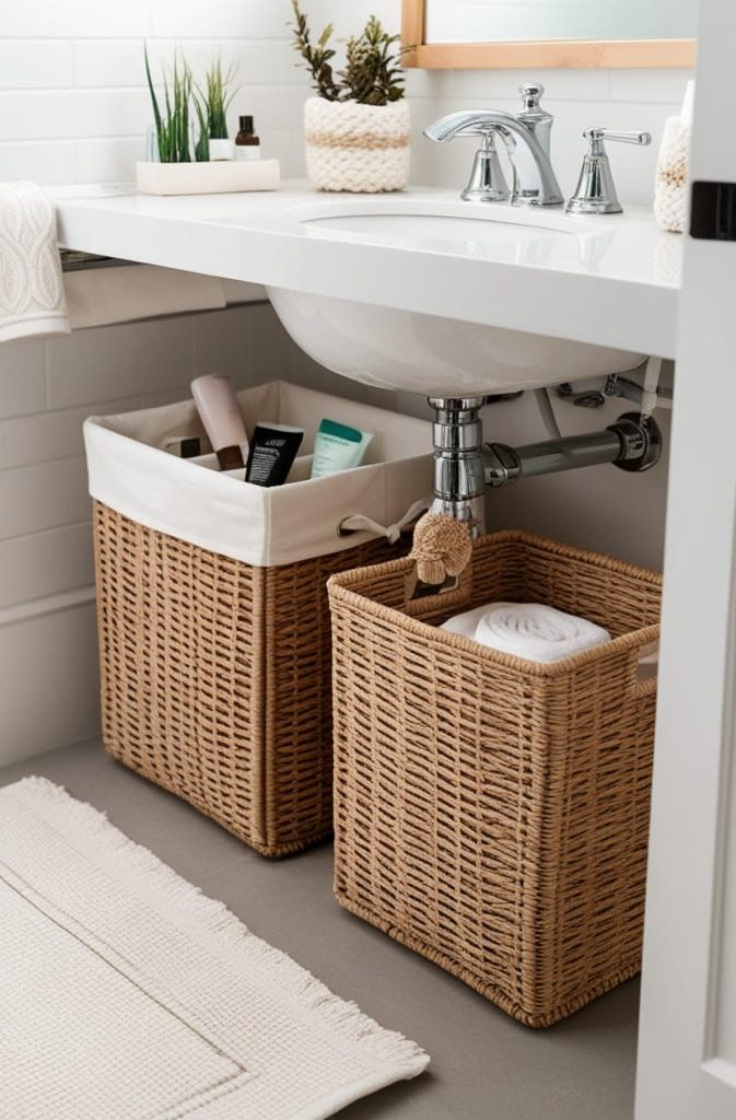 They’re also an easy way to update the bathroom’s aesthetic. You can swap baskets seasonally or coordinate them with towels and décor for a cohesive look.