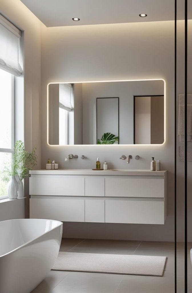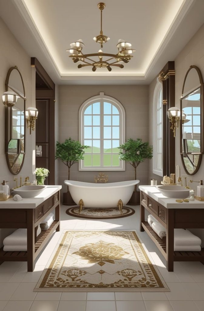 I design master bathrooms with symmetry in mind—matching mirrors, sinks, and lighting create a balanced look. Neutral colors help keep everything cohesive.