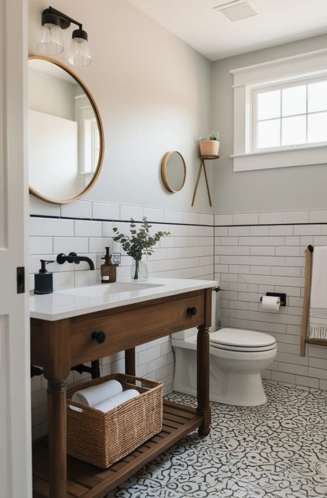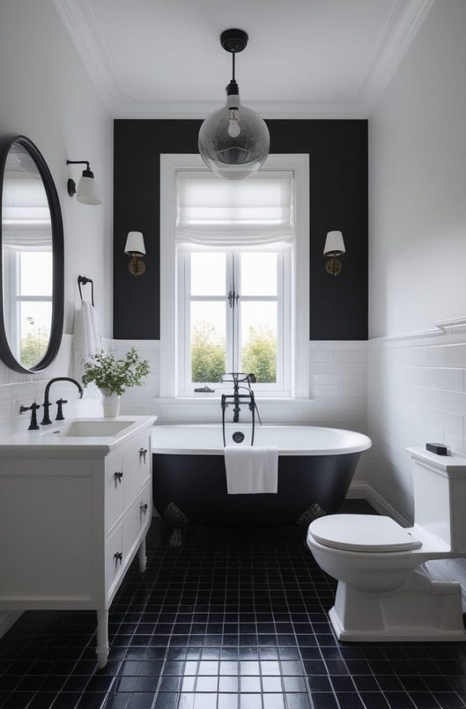 I like using white as the main color and black as an accent—on mirrors, fixtures, or flooring. This keeps the bathroom balanced and not too dark.