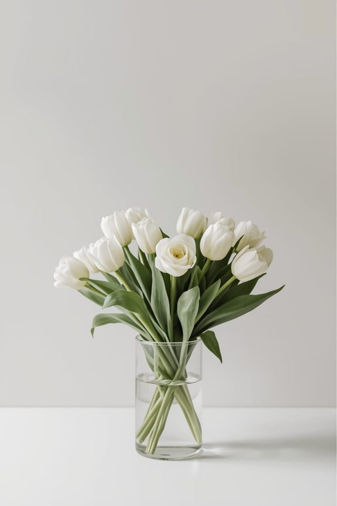 A single type of flower—like white roses or tulips—can be incredibly powerful. I keep the design clean and uncluttered.