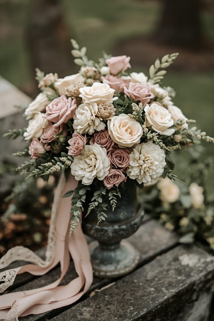 I like dusty pink roses, cream carnations, and soft greenery arranged in antique-style containers.