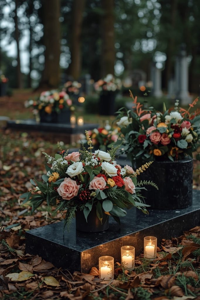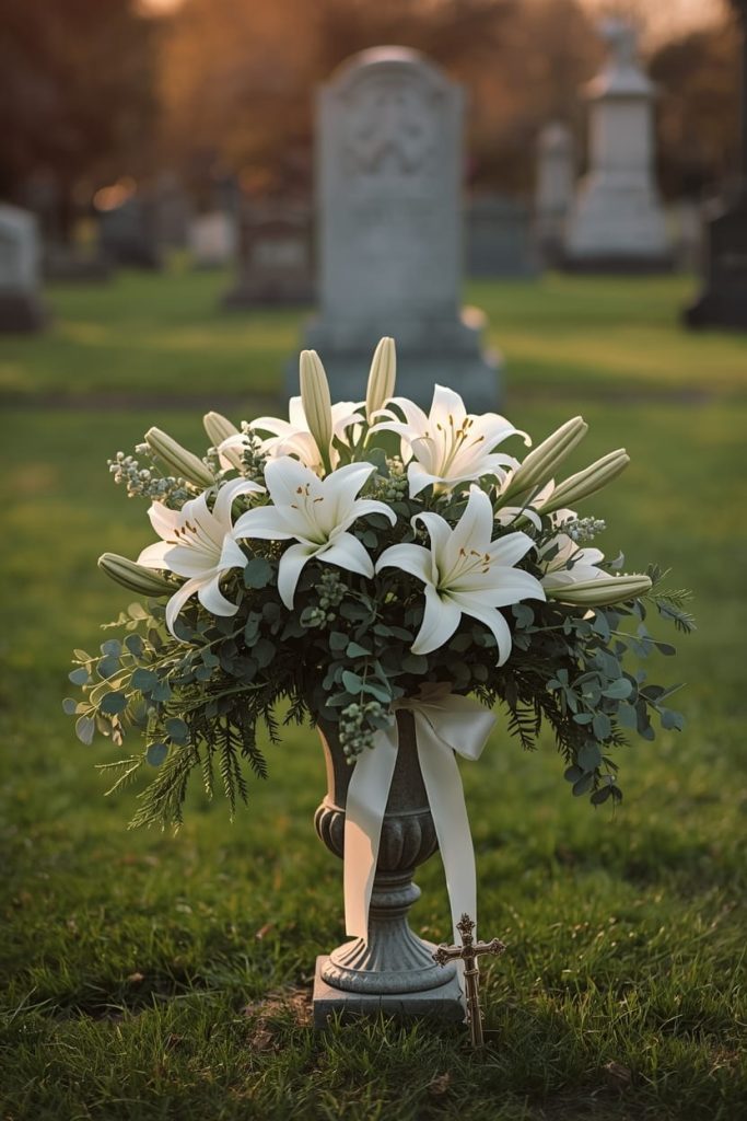 I usually place a simple bouquet of white lilies in a sturdy cemetery vase. Adding soft greenery like eucalyptus or fern creates a calm and elegant look without overwhelming the space.
