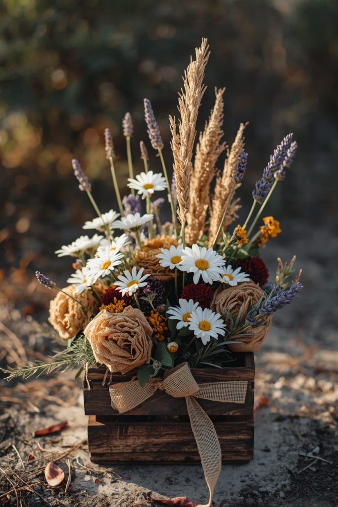 I like combining daisies, lavender, and greenery in a wooden box or basket. It gives a handmade, heartfelt feel.