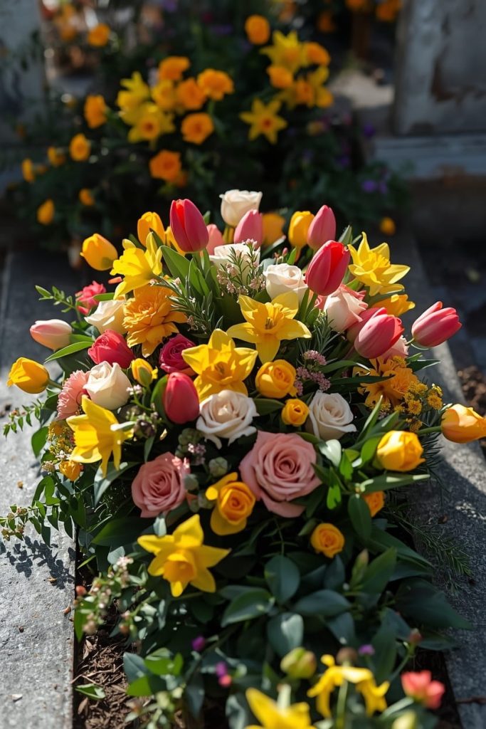 These designs bring energy and positivity to the space, making them ideal for colorful spring grave arrangements.
