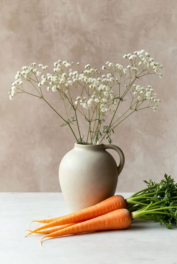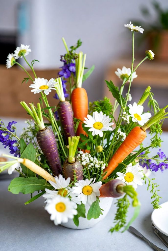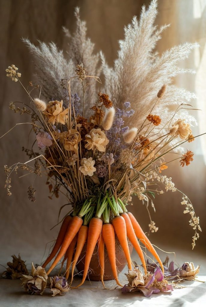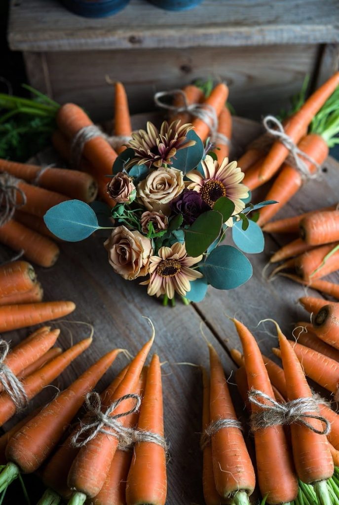 Sometimes I prefer a clean and simple look. A few carrots paired with a single type of flower create a minimalist carrot flower arrangement.