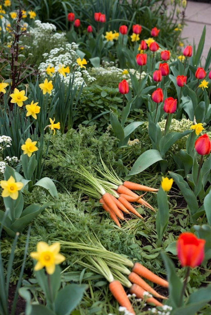 I arrange wildflowers loosely and tuck carrots throughout for a whimsical effect.