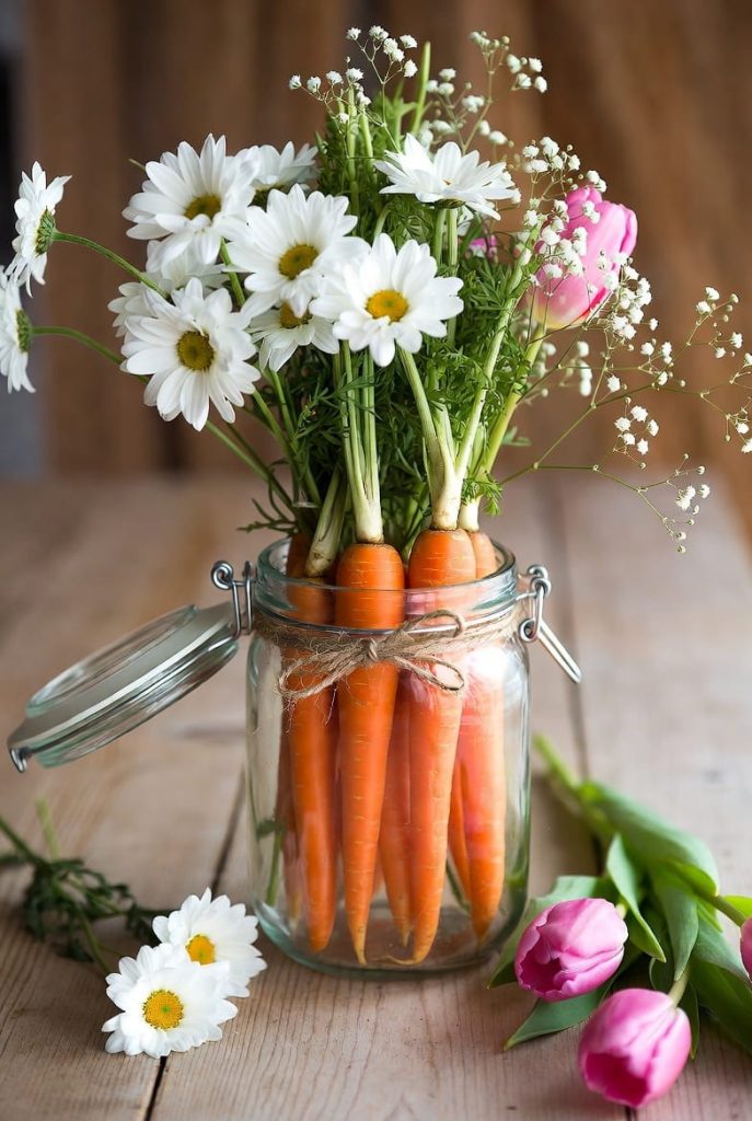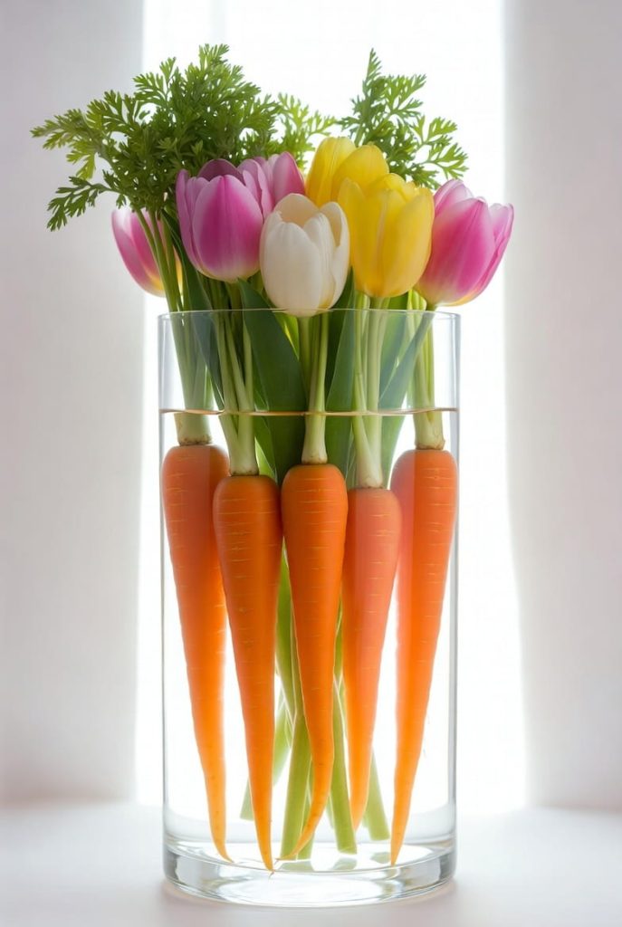 I place whole carrots along the inside of the jar and fill the center with flowers like daisies and tulips. The contrast between the bright orange and soft blooms feels fresh and inviting.