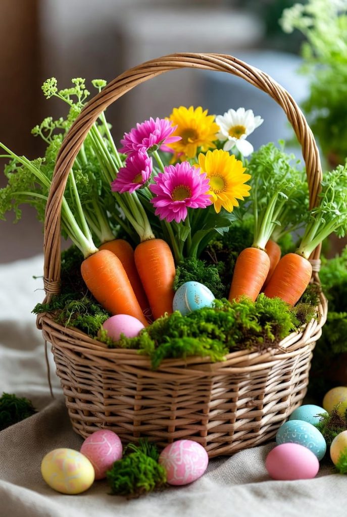 I love using baskets for Easter decor, and adding carrots makes them even more festive. This diy easter floral arrangement with carrots is both decorative and functional.