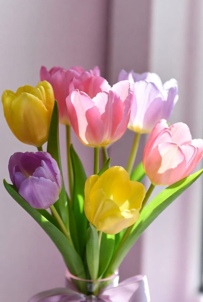 I love starting Easter decor with soft, pastel tones, and tulips are my go-to for this look. A simple vase filled with pink, yellow, and lavender tulips creates a stunning easter floral arrangement that feels effortlessly elegant.