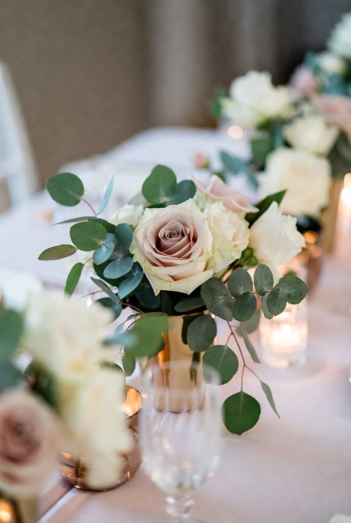 I often pair white or blush roses with eucalyptus for a clean and timeless design. This creates an elegant easter centerpiece that works perfectly for formal gatherings.