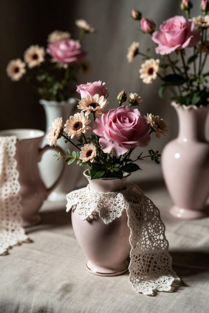 For a nostalgic feel, I go with a vintage easter floral centerpiece. Soft pinks, creams, and antique-style vases create a timeless look.