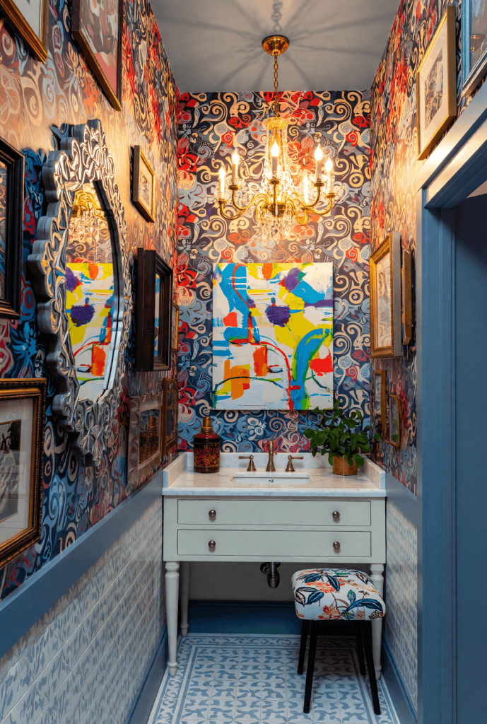 For people who love bold interiors, a maximalist powder room is a fantastic option. Instead of keeping things minimal, this design celebrates color, pattern, and texture.