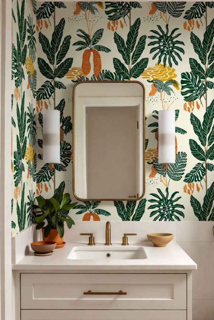 In a fun powder room, I often use playful wallpaper patterns like tropical prints, abstract art, or whimsical illustrations. These patterns turn the walls into the main focal point.