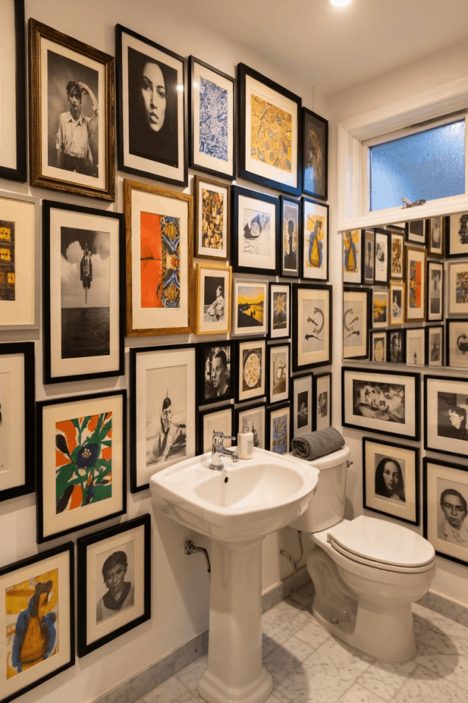 A gallery wall powder room is another creative idea I love. Instead of one piece of art, multiple framed prints create a visually exciting display.