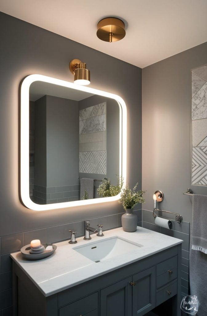I always layer lighting—ceiling lights, mirror lighting, and subtle accent lighting. Warm bulbs prevent grey from feeling cold or sterile.