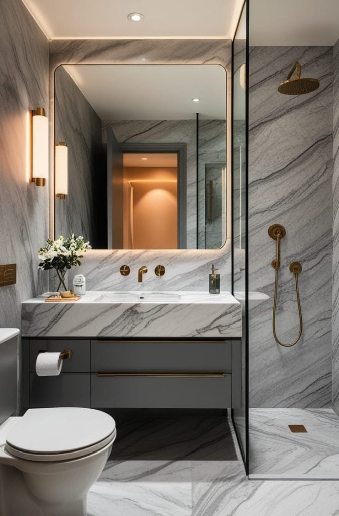 Paired with warm lighting and simple decor, grey marble creates a hotel-like atmosphere. It’s perfect for anyone wanting a high-end feel without going overboard.