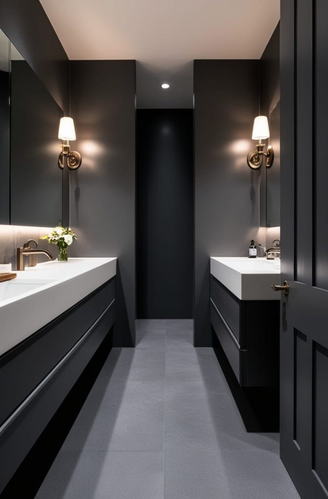 Lighting is essential here. Wall sconces, warm LEDs, or backlit mirrors soften the darkness and highlight textures. Dark grey works best when it feels rich, not gloomy, and thoughtful lighting makes all the difference.
