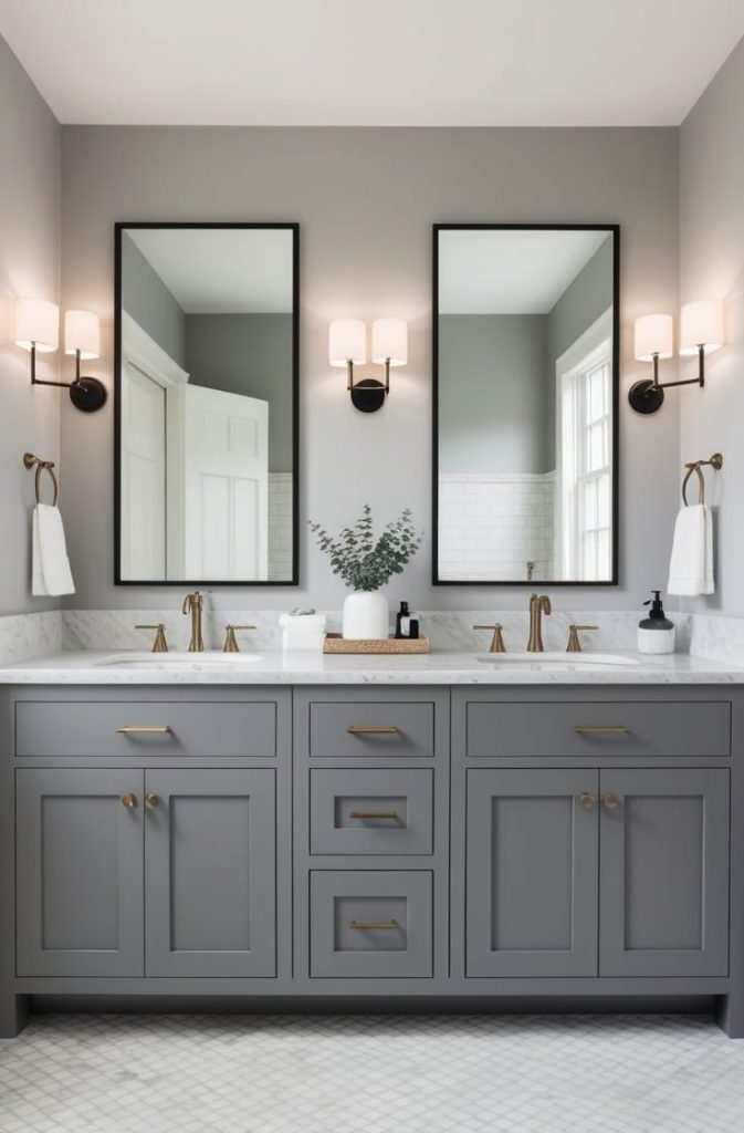 I love pairing grey vanities with white or marble countertops and brushed metal hardware. This combination feels balanced, modern, and timeless at the same time.