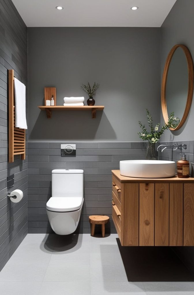 This combination works especially well in spa-inspired or Scandinavian-style bathrooms. Grey keeps things calm, while wood makes the space feel cozy and lived-in.