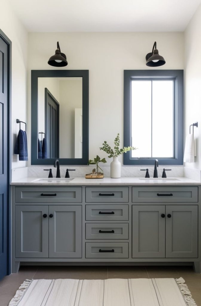 If you’re going more elegant, try a shaker-style vanity with dual mirrors and brass fixtures. For a modern minimalist vibe, go with a floating double vanity in a warm wood finish.