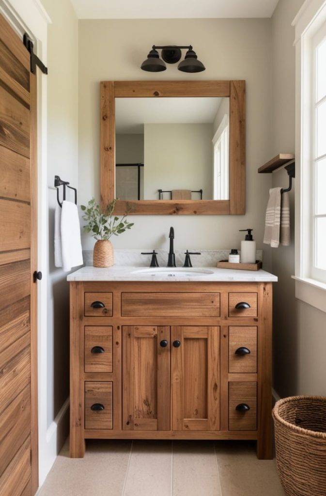3. Rustic Wood Vanity — Add Warmth With a Natural, Earthy Look
