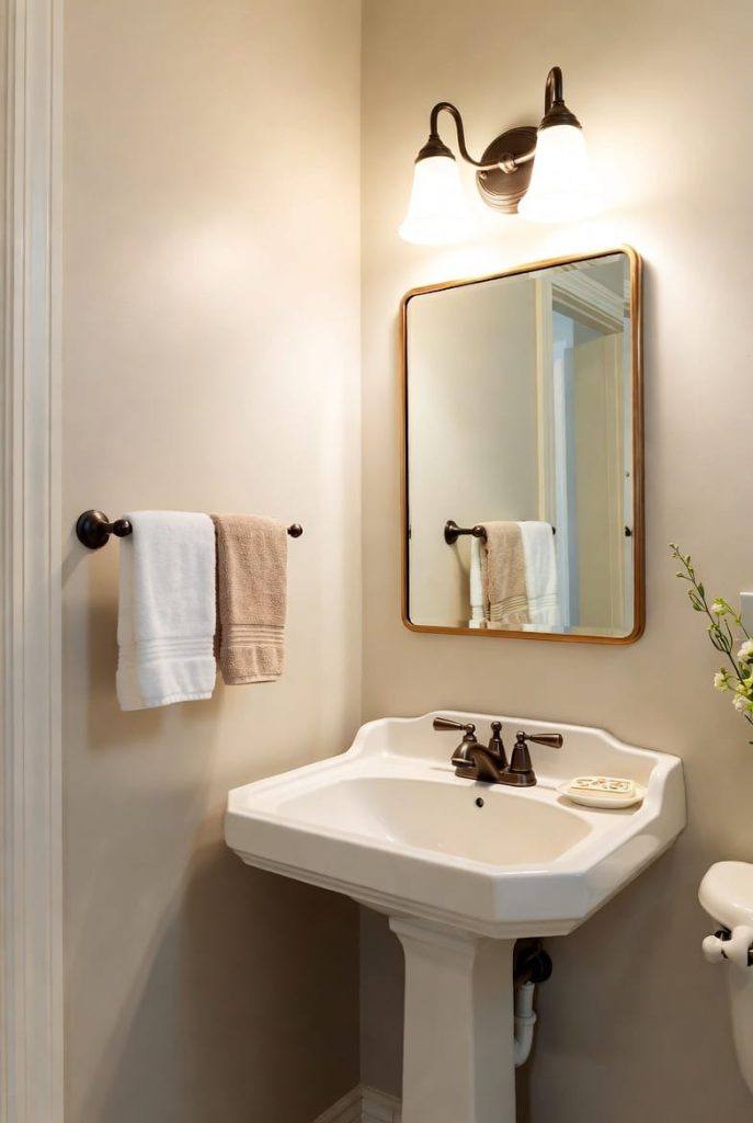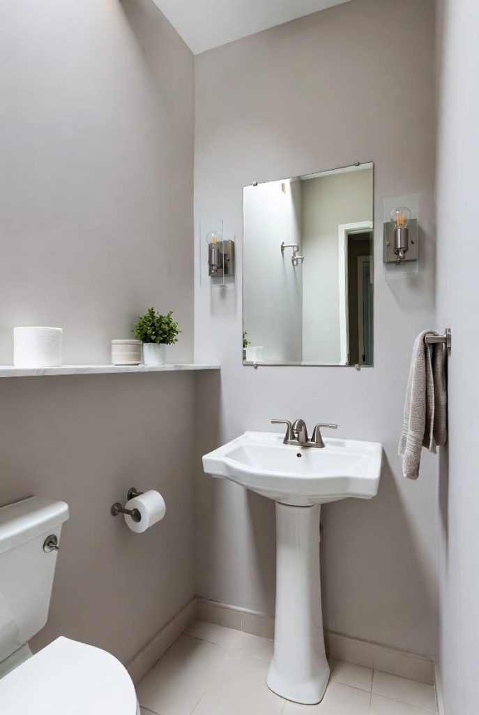 These simple adjustments make a tiny half bath pedestal sink design feel larger and more comfortable.