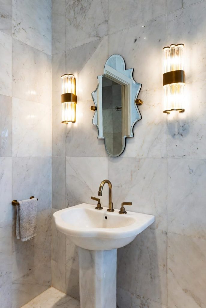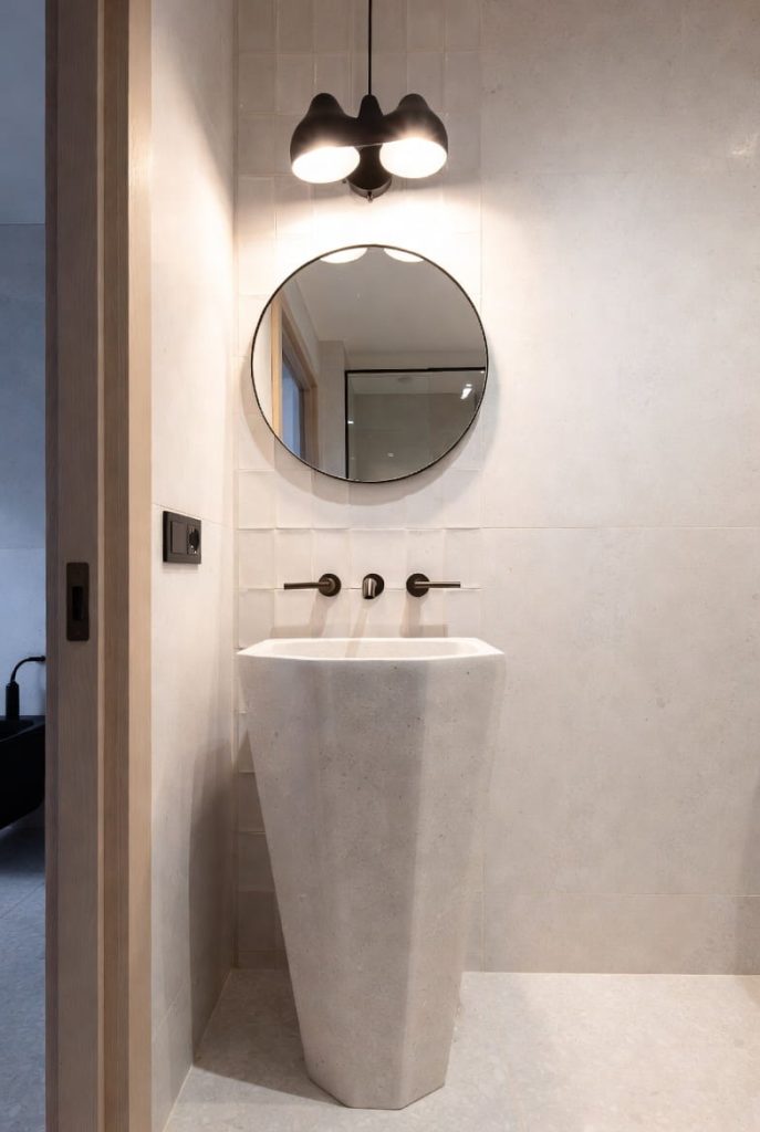 I like to combine a sculptural pedestal sink with marble walls or elegant tile patterns. Gold or brushed brass fixtures add warmth and sophistication.