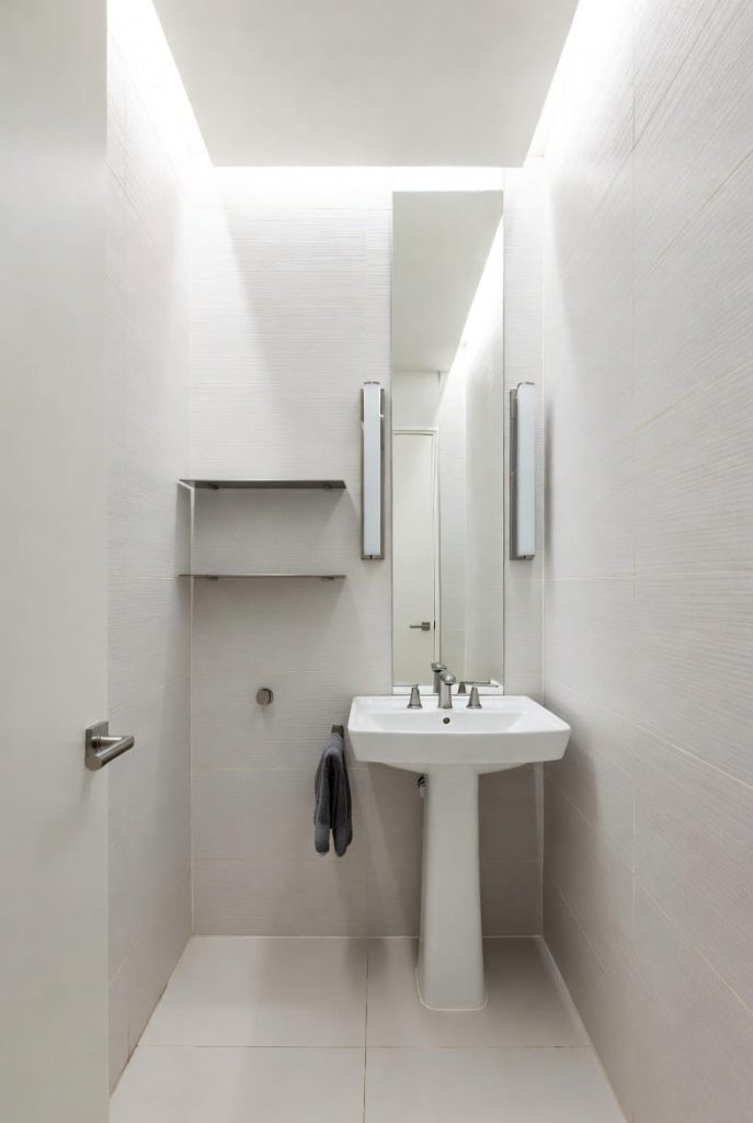 To maximize the layout, I like to place the pedestal sink against a narrow wall and install a tall mirror above it. Vertical elements make the room appear larger and brighter.