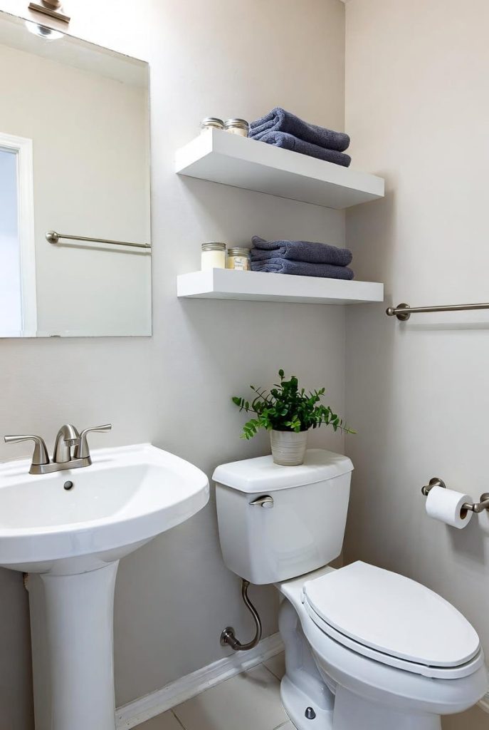 Storage is often the biggest challenge in half bathrooms with pedestal sinks. Since the sink doesn’t include cabinetry, I like adding floating shelves above the toilet or beside the sink.