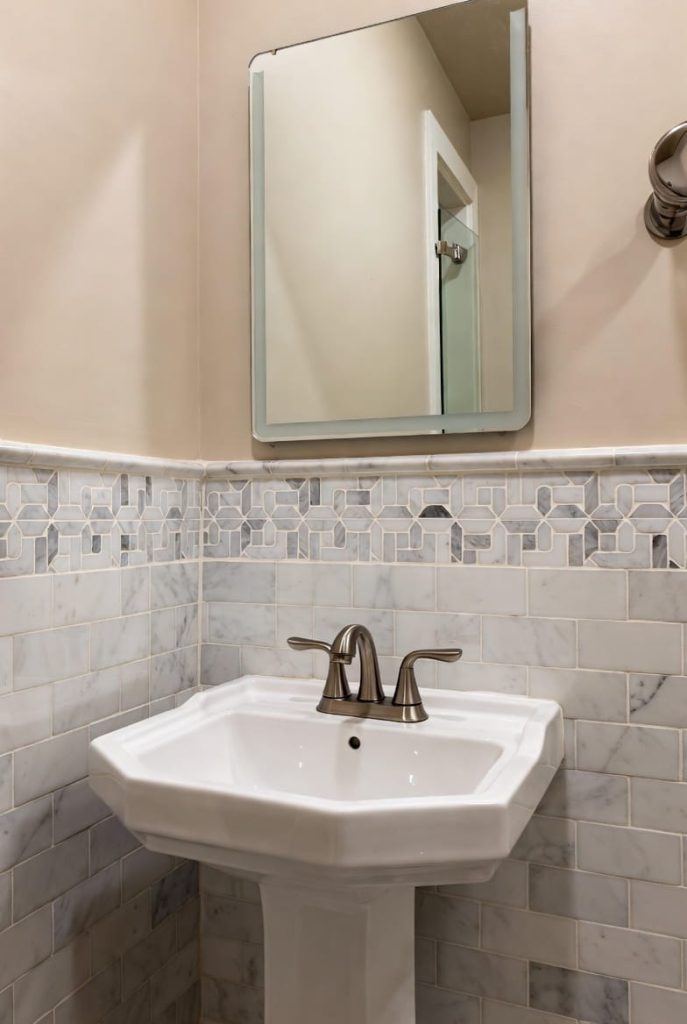 10. A Pedestal Sink Design With a Stylish Tile Backsplash