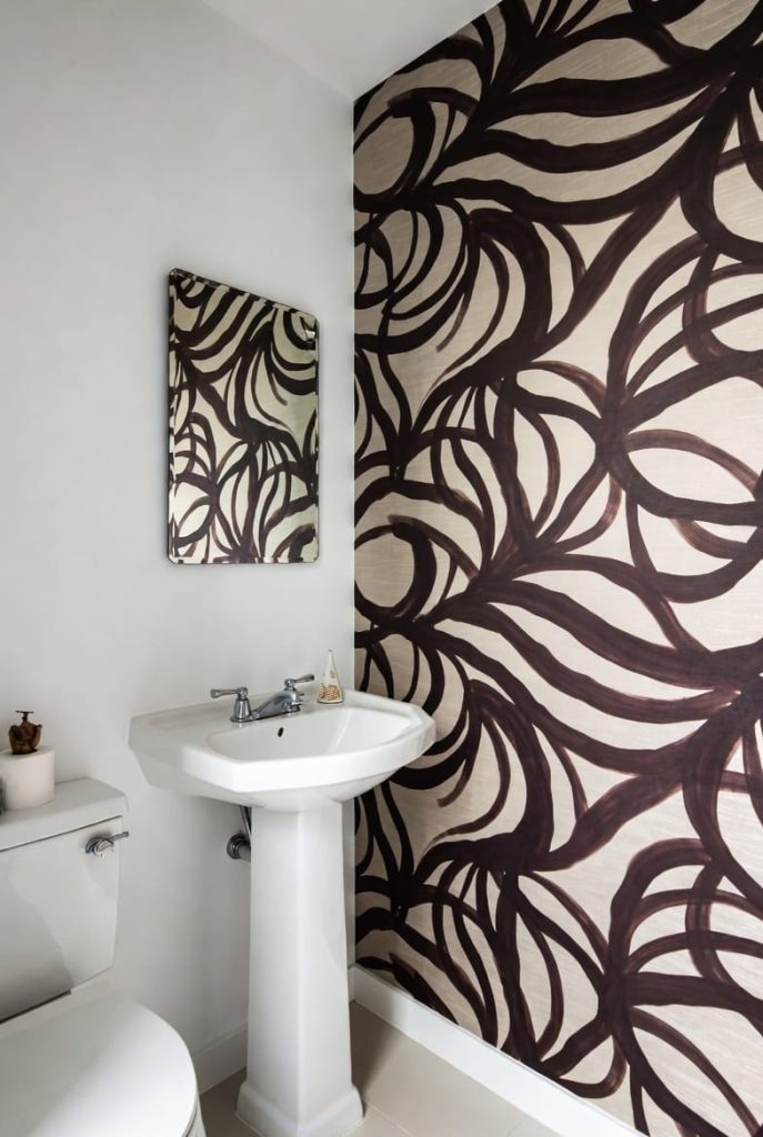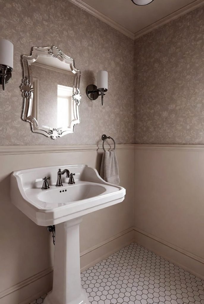 Patterns like botanical prints, geometric designs, or subtle textures work beautifully in small powder rooms.