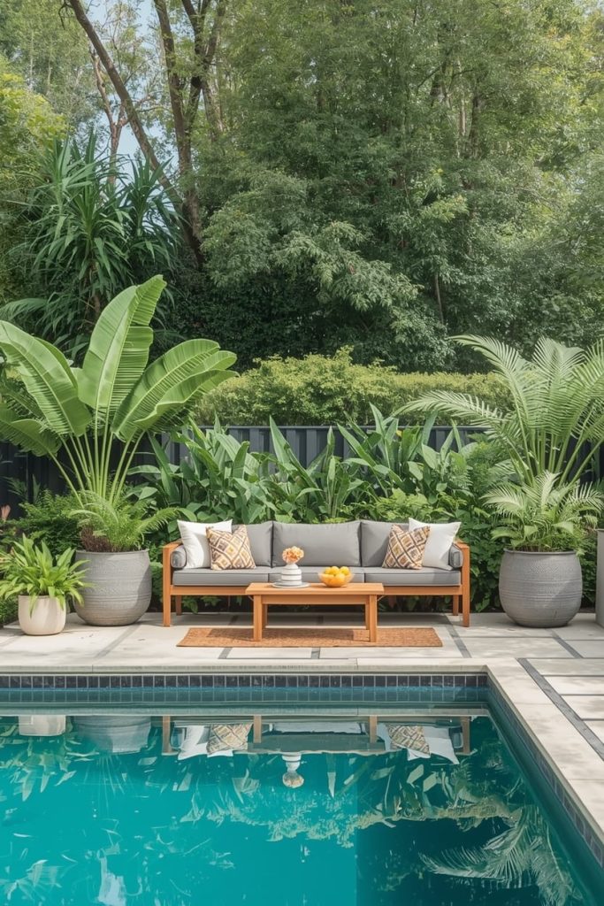 2. Tropical Pool Deck Decor with Lush Landscaping