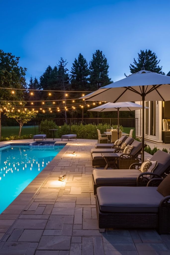 I combined string lights pool deck designs with pathway lighting to create layers of illumination.