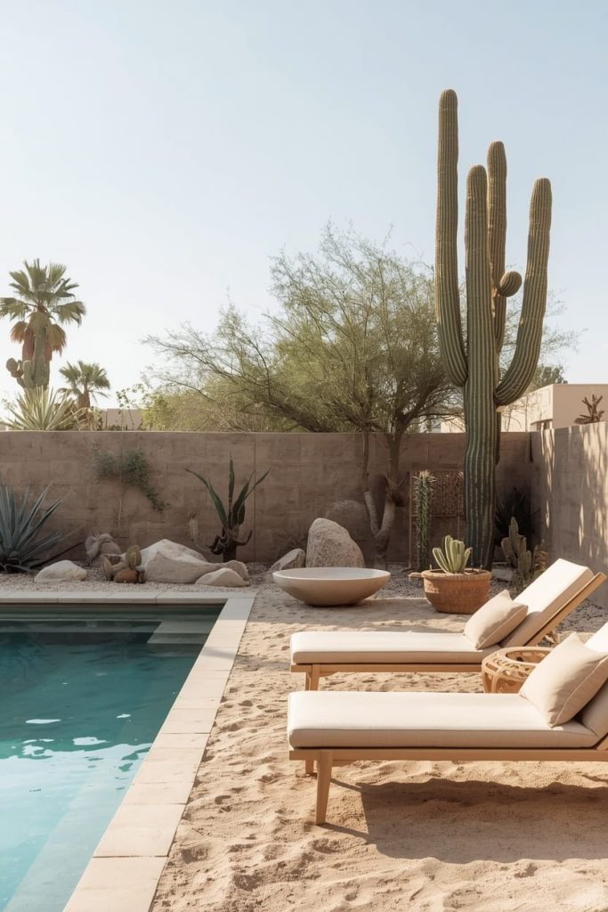 I usually use sand-toned materials, cactus plants, and stone textures to build a soft, earthy atmosphere. It feels like a private desert resort in your own backyard.