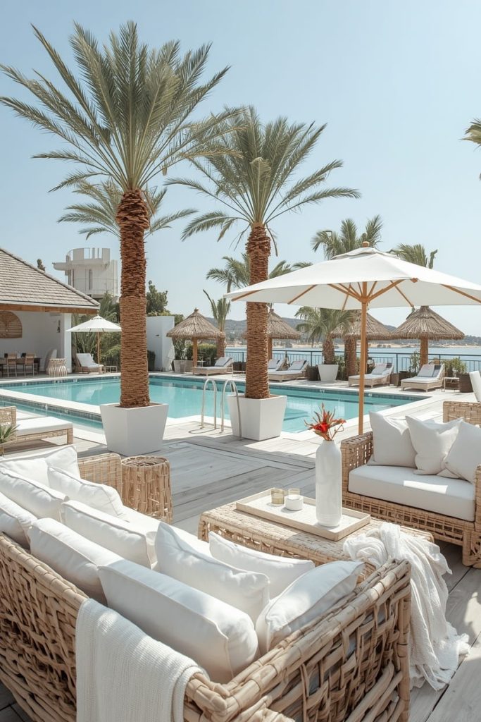 When I want a relaxed vacation vibe, I design a coastal beach club outdoor pool space. It feels like stepping into a luxury seaside resort.