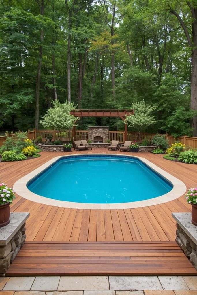 I recommend wrapping the deck partially around the pool instead of fully enclosing it. This keeps the space open while still offering usability. These oval swimming pool deck ideas are especially useful in narrow backyards.