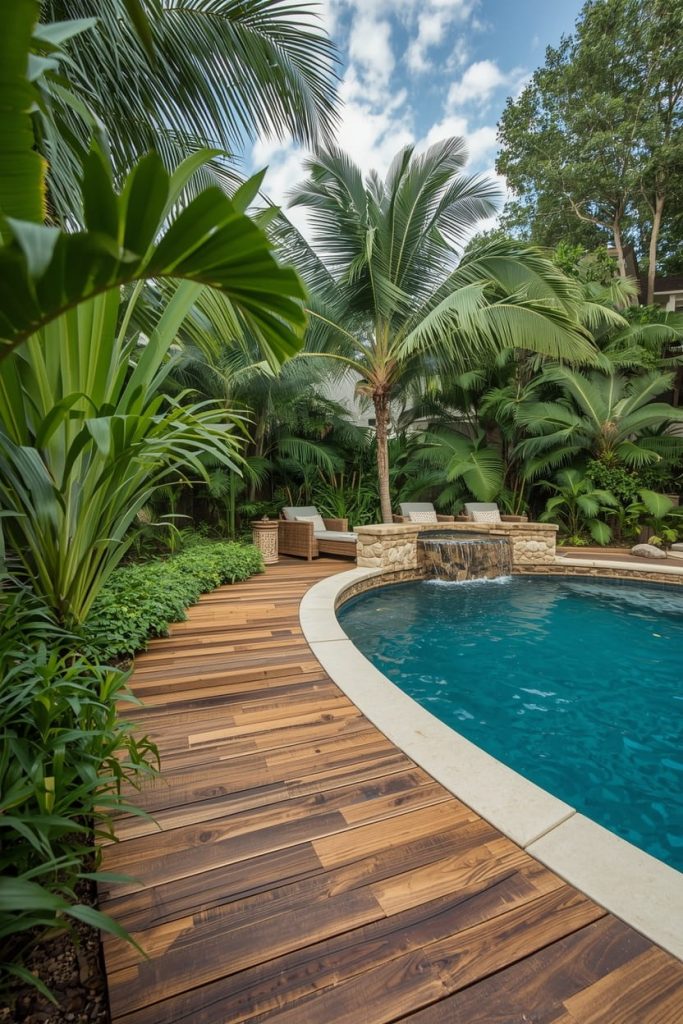 One of my favorite transformations is creating oval pool deck landscaping ideas with a tropical theme. This style turns the backyard into a vacation-inspired retreat filled with greenery and natural textures.