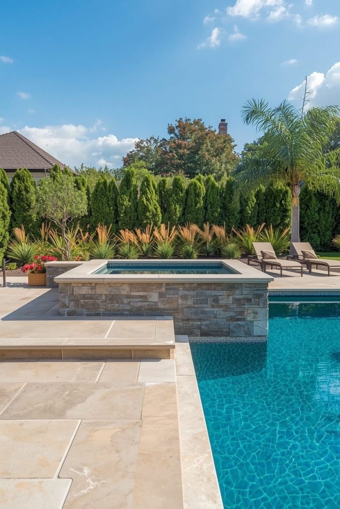 Travertine is popular in high-end pool coping ideas because it stays cool underfoot and has a soft, elegant texture. I often use it in Mediterranean-style backyards.