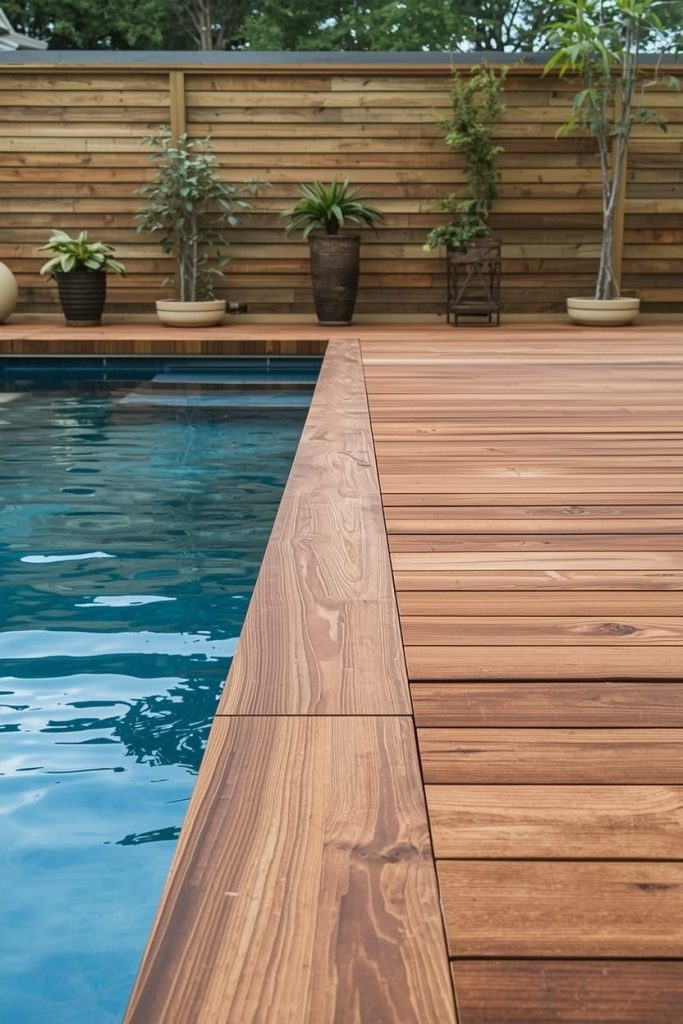This falls under wood pool coping alternatives, where composite or stamped concrete mimics natural timber. It works beautifully in backyard retreat designs.