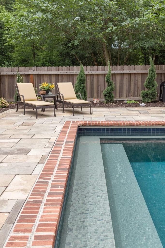 Brick coping is one of the most traditional pool coping ideas I use in rustic or vintage-inspired backyard designs. It creates a warm and structured border around the pool.