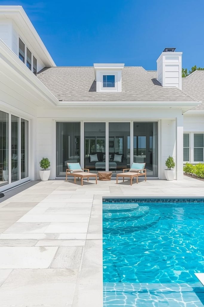 This is a classic choice in pool deck color ideas for luxury homes and beach-inspired designs. It pairs perfectly with turquoise water and greenery.