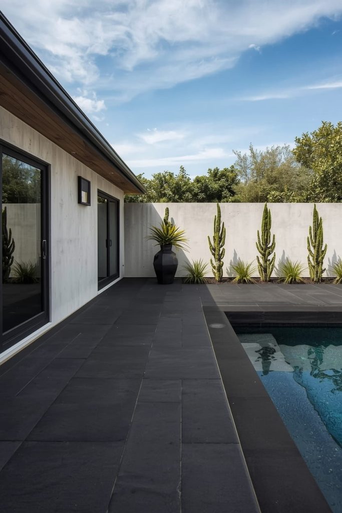 This is one of the most modern pool deck color ideas because it adds depth and sophistication. It works especially well with minimalist architecture.