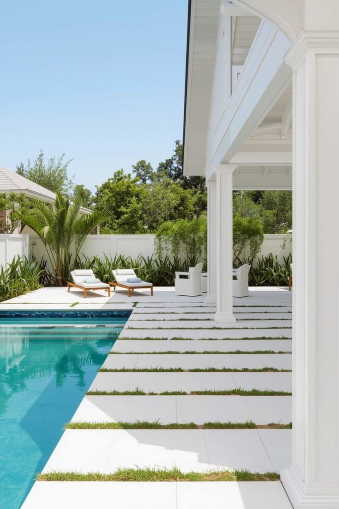 When I think of a fresh, resort-like backyard, white pool deck ideas always come to mind. White surfaces reflect sunlight beautifully, making the space feel open and airy.