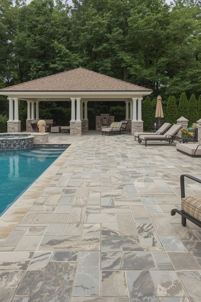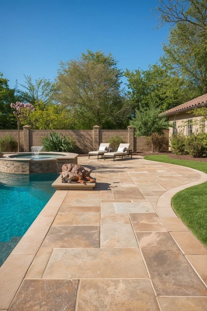 I always appreciate stone inspired pool deck ideas because they combine durability with natural beauty. These tones mimic real stone textures like slate, granite, or travertine.