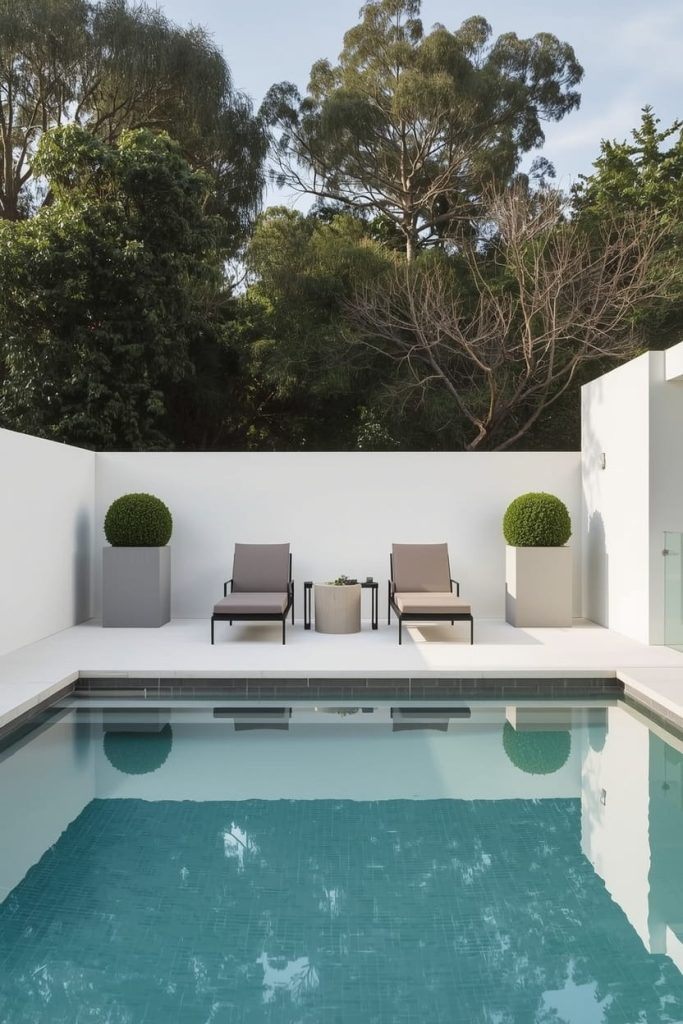 Use neutral tones like white, gray, and beige. Add sleek outdoor furniture with straight lines to enhance that modern pool deck aesthetic. Avoid clutter—less really is more here.